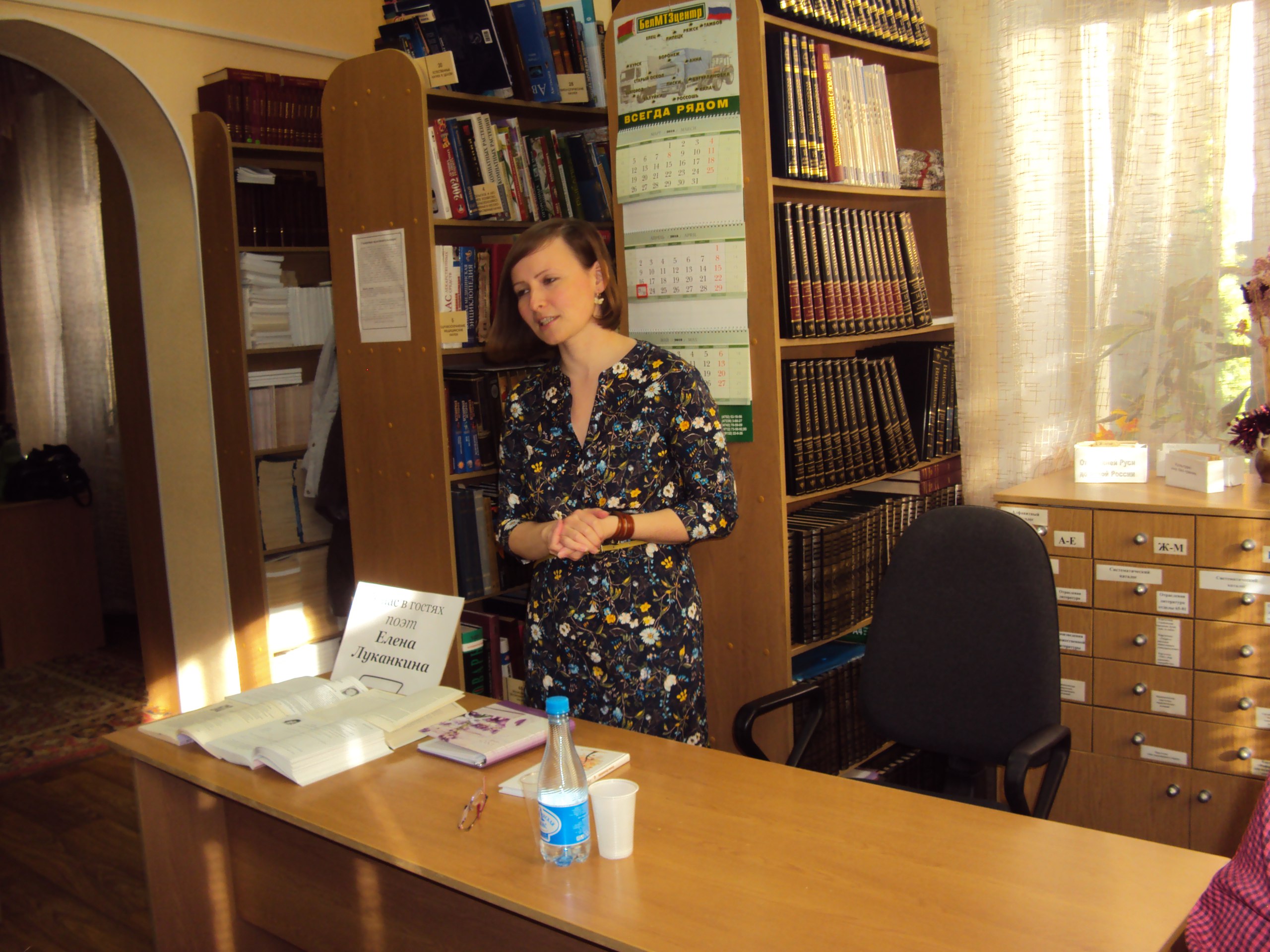 В гости к читателям пришла поэт Елена Луканкина. В уютной камерной атмосфере небольшого зала библиотеки состоялась эта творческая встреча. Елена Львовна рассказала о своём творчестве, прочитала стихи о любви, природе, гражданскую лирику, а также притчу «Дерево на утёсе», поведала о своих книгах и творческих планах.