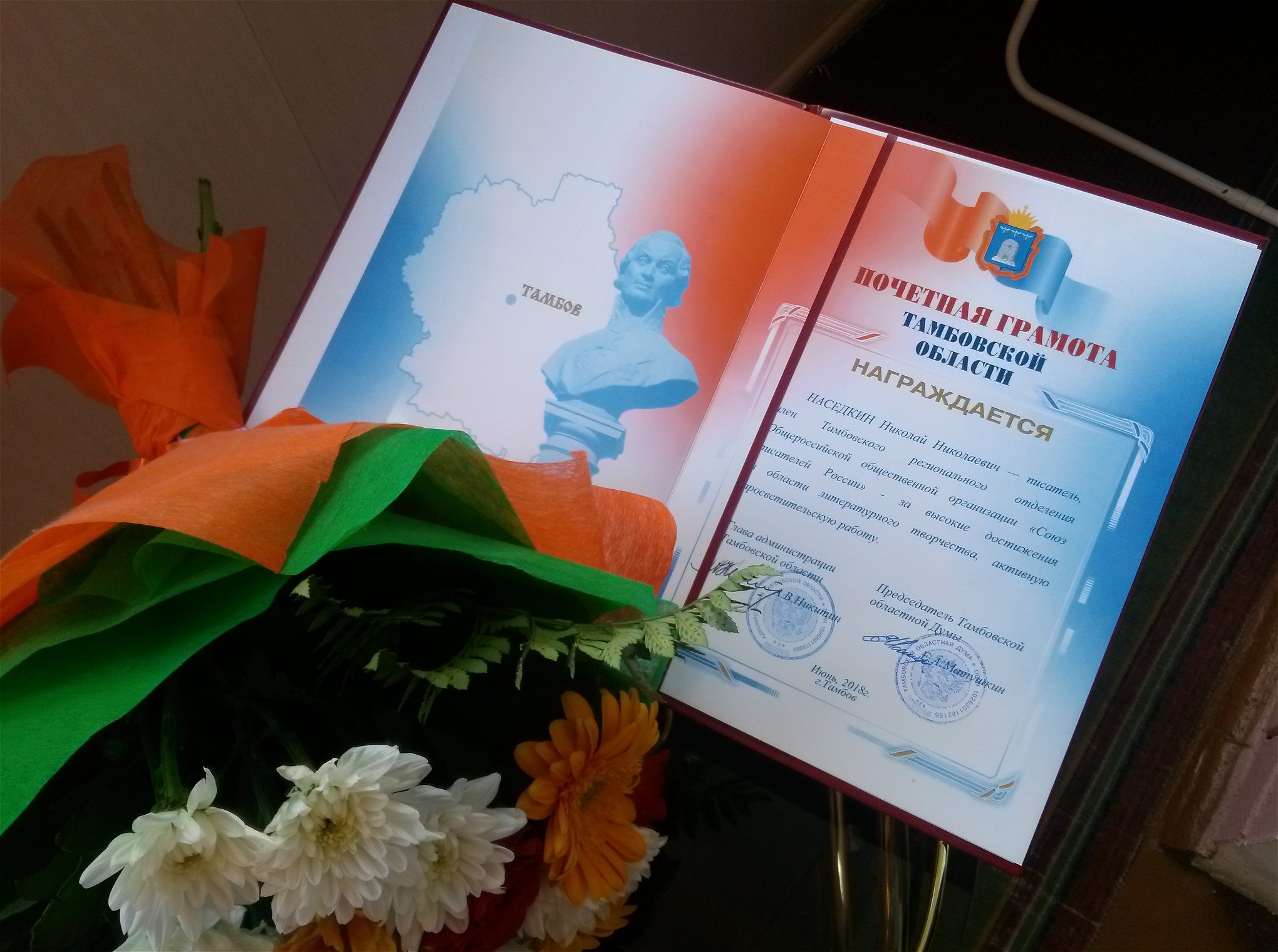 Прозаика и литературоведа Николая Наседкина, отметившего в этом году своё 65-летие, наградили Почётной грамотой Тамбовской области с формулировкой «За высокие достижение в области литературного творчества…» Эту высшую награду Тамбовщины писателю вручили 22 августа на церемонии, посвящённой Дню Государственного флага России.