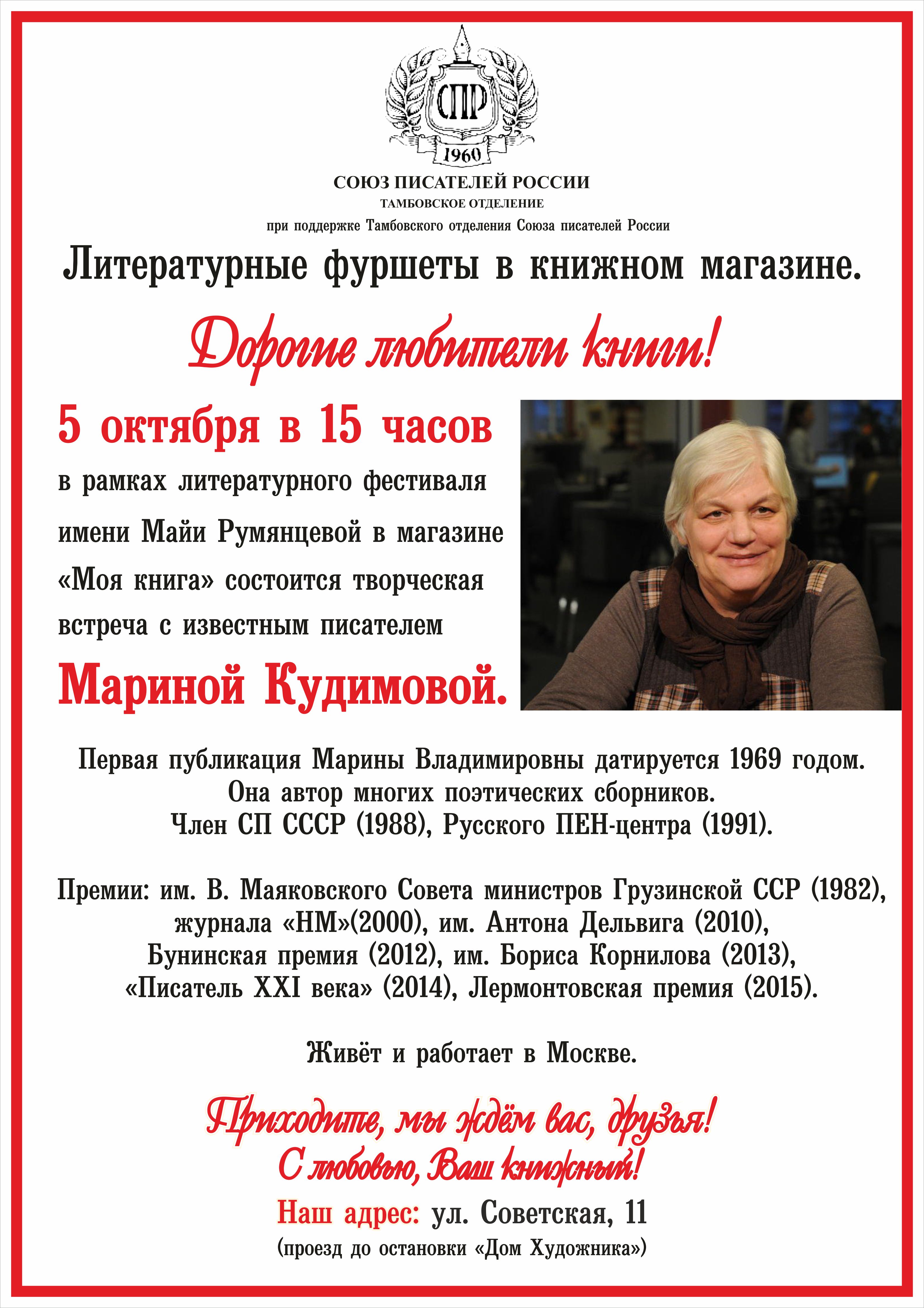 В рамках Первого литературного фестиваля имени Майи Румянцевой 5 октября 2019 года состоится творческая встреча с Мариной Кудимовой, поэтессой, переводчиком. публицистом, общественным деятелем…