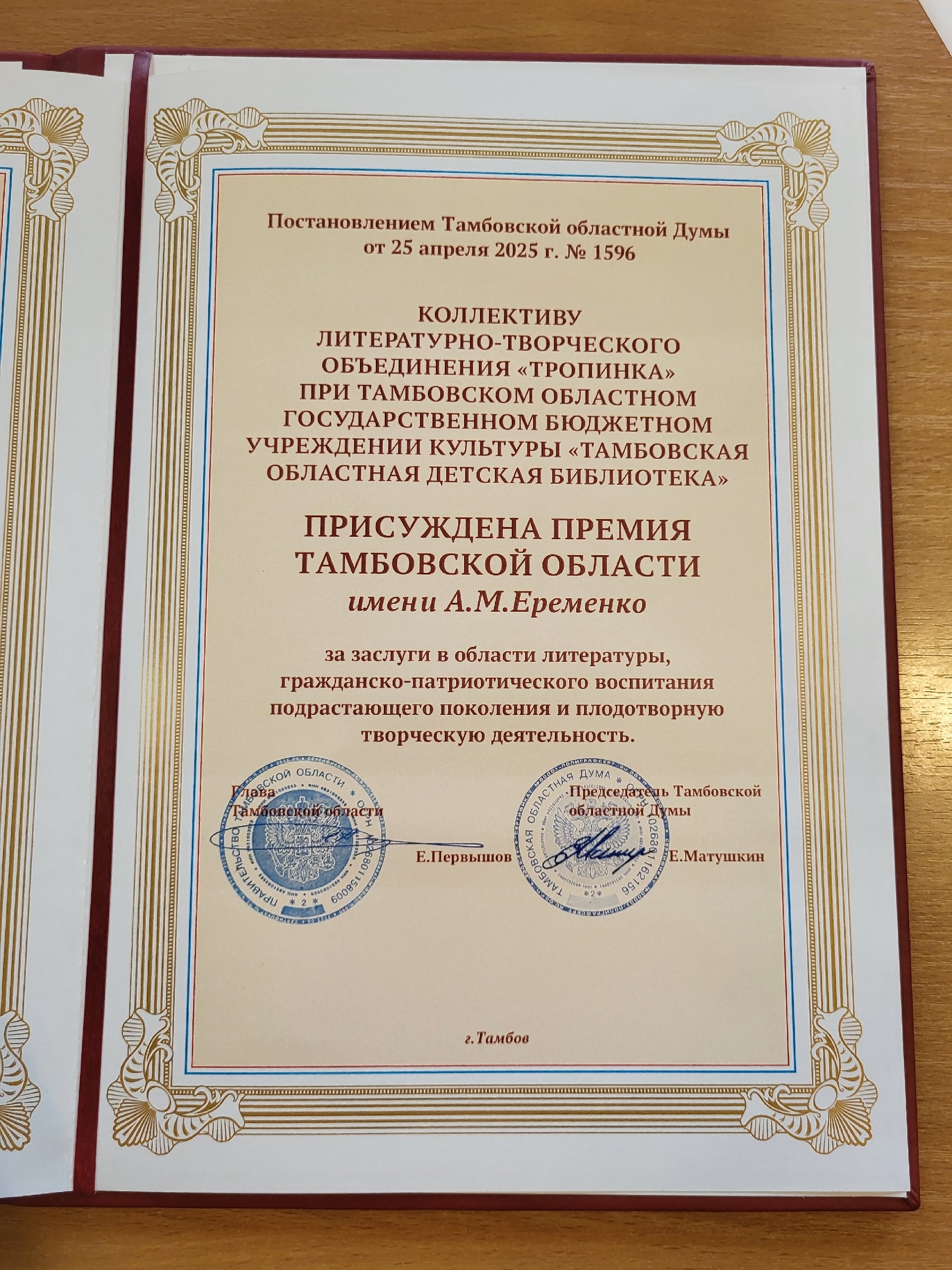 В этом году лауреатом Тамбовской областной премии имени писателя Анатолия Михайловича Ерёменко стало литературно-творческое объединение «Тропинка» при Тамбовской областной детской библиотеке. Премия вручена за заслуги в области литературы, гражданско-патриотического воспитания подрастающего поколения и плодотворную творческую деятельность.